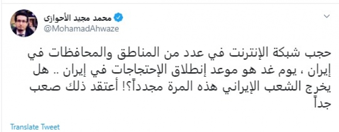 وقال في تغريدة عبر "تويتر" رصدها "المشهد العربي": "حجب شبكة الإنترنت في عدد من المناطق والمحافظات في إيران ، يوم غد هو موعد انطلاق الإحتجاجات في إيران.. هل يخرج الشعب الإيراني هذه المرة مجدداً؟! أعتقد ذلك صعب جداً".