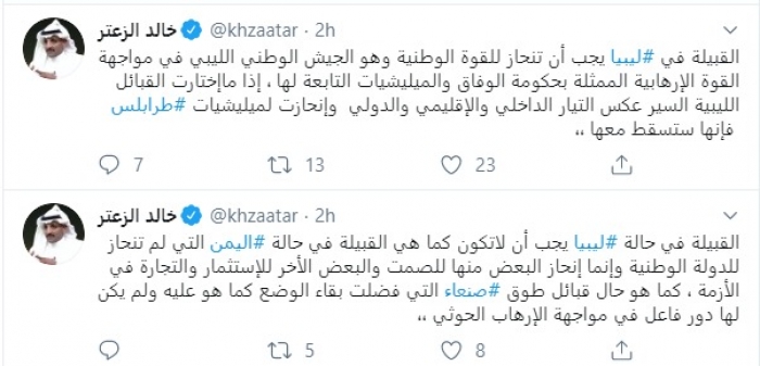 طالب المحلل السياسي السعودي خالد الزعتر، اليوم، القبائل في ليبيا بالوقوف إلى جانب الجيش الليبي ضد المليشيات التابعة لحكومة الوفاق في العاصمة طرابلس، مؤكدًا أن قبائل طوق صنعاء لم يكن لها دور فاعل في مواجهة مليشيات الحوثي.