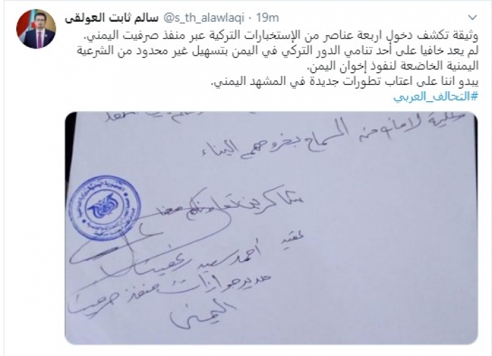 وقال في تغريدة عبر "تويتر" رصدها "المشهد العربي": "وثيقة تكشف دخول أربعة عناصر من الاستخبارات التركية عبر منفذ صرفيت اليمني. لم يعد خافيا على أحد تنامي الدور التركي في اليمن بتسهيل غير محدود من الشرعية اليمنية الخاضعة لنفوذ إخوان اليمن. يبدو أننا على أعتاب تطورات جديدة في المشهد اليمني".