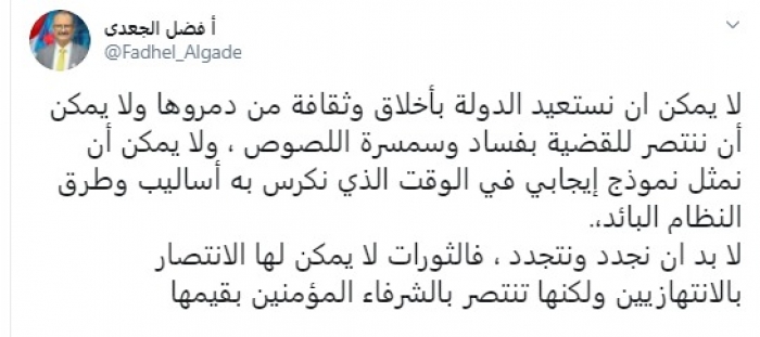 وكتب في تغريدة عبر "تويتر" رصدها "المشهد العربي": "لا يمكن أن نستعيد الدولة بأخلاق وثقافة من دمروها ولا يمكن أن ننتصر للقضية بفساد وسمسرة اللصوص، ولا يمكن أن نمثل نموذج إيجابي في الوقت الذي نكرس به أساليب وطرق النظام البائد لا بد أن نجدد ونتجدد، فالثورات لا يمكن لها الانتصار بالانتهازيين ولكنها تنتصر بالشرفاء المؤمنين بقيمها".