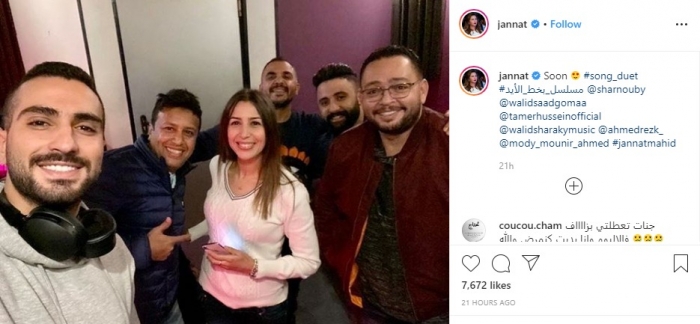 نشرت المطربة المغربية جنات صورة، عبر حسابها الشخصي بموقع "إنستجرام"، من كواليس تسجيل تتر مسلسل "بخط الإيد".
