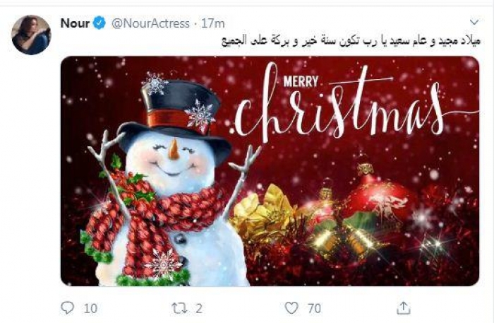 وكتبت نور، عبر حسابها على "تويتر"، قائلة: "ميلاد مجيد.. وعام سعيد.. يا رب تكون سنة خير وبركة على الجميع".