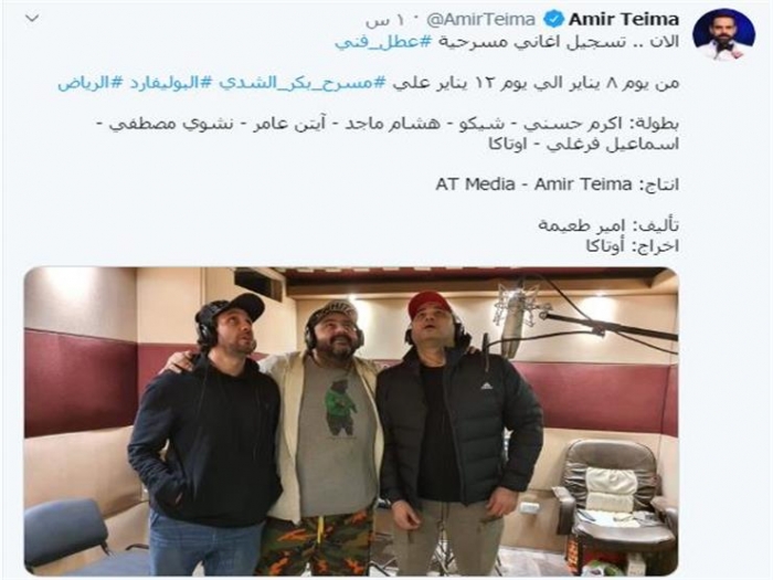 نشر المؤلف والشاعر الغنائي أمير طعيمة، مؤلف ومنتج مسرحية "عطل فني"، عبر حسابه الشخصي بموقع "تويتر"، صورة من تسجيل أغاني المسرحية.