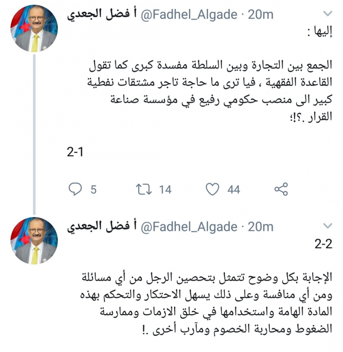 أكد عضو هيئة رئاسة المجلس الانتقالي الجنوبي، فضل الجعدي، أن الجمع بين التجارة وبين السلطة مفسدة كبرى كما تقول القاعدة الفقهية.