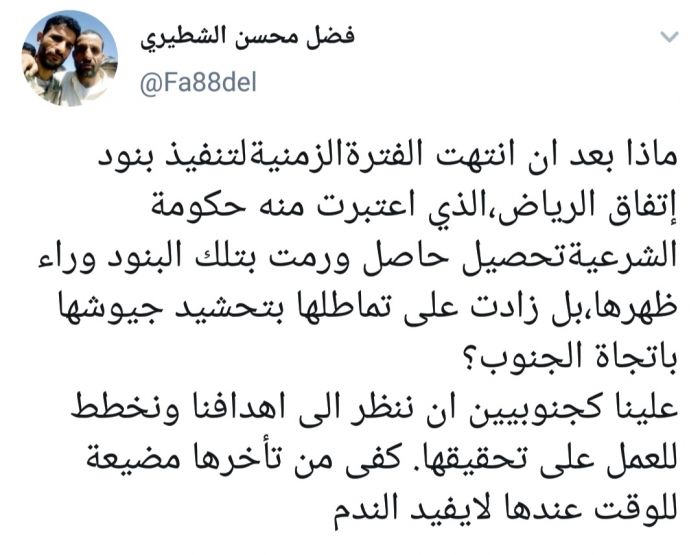 وكتب الشطيري، في تغريدة له عبر موقع التواصل الاجتماعي تويتر، تابعها المشهد العربي: "ماذا بعد أن انتهت الفترة الزمنية لتنفيذ بنود اتفاق الرياض، الذي اعتبرت منه حكومة الشرعية تحصيل حاصل ورمت بتلك البنود وراء ظهرها، بل زادت على تماطلها بتحشيد جيوشها باتجاة الجنوب؟".