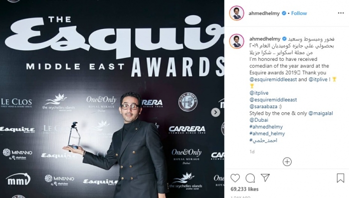 وكتب حلمي: "فخور ومبسوط وسعيد بحصولي على جائزة كوميديان العام 2019 من مجلة اسكواير، شكرا جزيلا".