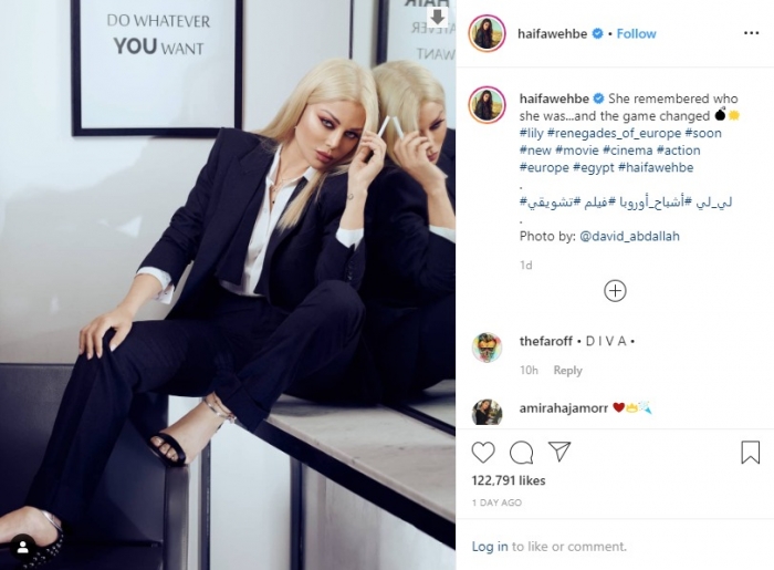 وظهرت هيفاء وهبي في الصورة وهي ترتدي بدلة سوداء وممسكة بسيجارة.