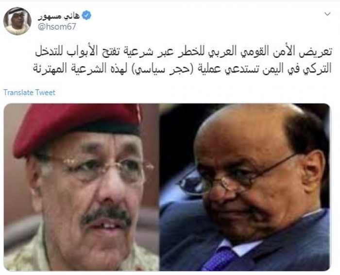 وقال في تغريدة عبر "تويتر" رصدها "المشهد العربي": "تعريض الأمن القومي العربي للخطر عبر شرعية تفتح الأبواب للتدخل التركي في اليمن تستدعي عملية (حجر سياسي) لهذه الشرعية المهترئة" .