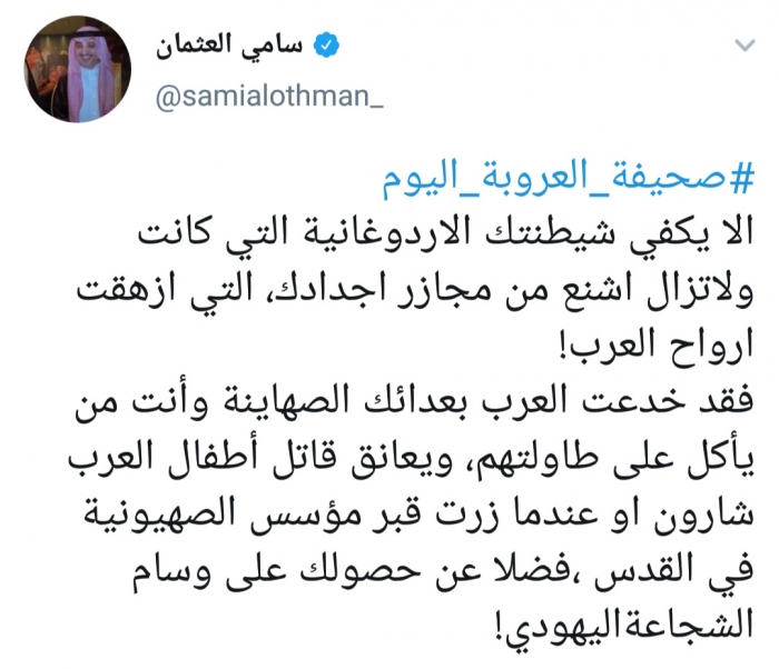 وكتب العثمان، في تغريدة له على موقع التواصل الاجتماعي تويتر، تابعها المشهد العربي: "ألا يكفي شيطنتك الأردوغانية التي كانت ولاتزال أشنع من مجازر أجدادك، التي أزهقت أرواح العرب".