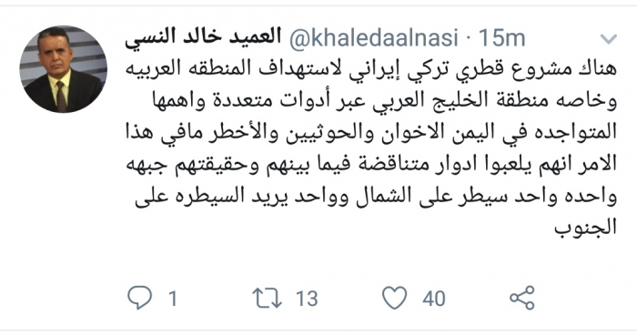 وكتب النسي، في تغريدة له على موقع التواصل الاجتماعي تويتر، تابعها المشهد العربي: "هناك مشروع قطري تركي إيراني لاستهداف المنطقة العربية وخاصة منطقة الخليج العربي عبر أدوات متعددة وأهمها المتواجدة في اليمن الإخوان والحوثيين".
