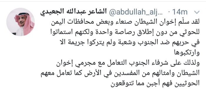 وصف الشاعر عبدالله الجعيدي، مليشيات الإخوان التابعة للشرعية بـ "الجبناء".