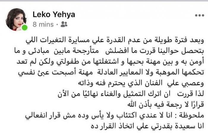 وكتبت لقاء، عبر حسابها على فيس بوك: "بعد فترة طويلة من عدم القدرة على مسايرة التغييرات اللي بتحصل حوالينا قررت ما أفضلش متأرحجة ما بين مبادئي وما أؤمن به، وبين مهنة بحبها واشتغلتها من طفولتي، ولكن لم تعد تحكمها الموهبة ولا المعايير العادلة، مهنة أصبحت عبئا نفسيا وعصبيا على الفنان الذي يحترم فنه وذاته".