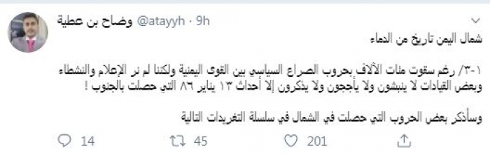 وقال في تغريدات عبر "تويتر" رصدها "المشهد العربي": "شمال اليمن تاريخ من الدماء رغم سقوط مئات الآلاف بحروب الصراع السياسي بين القوى اليمنية ولكننا لم نر الإعلام والنشطاء وبعض القيادات لا ينبشون ولا يأججون ولا يذكرون إلا أحداث ١٣ يناير ٨٦ التي حصلت بالجنوب! وسأذكر بعض الحروب التي حصلت في الشمال في سلسلة التغريدات التالية".