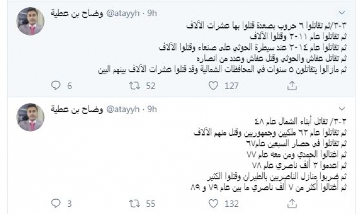 وأوضح: "ثم تقاتلوا ٦ حروب بصعدة قتلوا بها عشرات الآلاف.. تقاتلوا عام ٢٠١١ وقتلوا الآلاف.. تقاتلوا عام ٢٠١٤ عند سيطرة الحوثي على صنعاء وقتلوا الآلاف.. تقاتل عفاش والحوثي وقتل عفاش وعدد من أنصاره.. ما زالوا يتقاتلون ٥ سنوات في المحافظات الشمالية وقد قتلوا عشرات الآلاف بينهم البين".