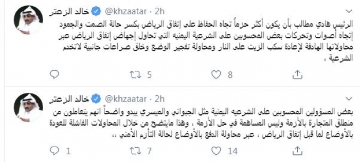 طالب المحلل السياسي السعودي خالد الزعتر، اليوم، الرئيس اليمني المؤقت عبدربه منصور هادي، بأن يكون أكثر حزمًا تجاه الحفاظ على اتفاق الرياض، مشيرًا إلى أن بعض المسؤولين التابعين لحكومة الشرعية – في إشارة للمدعو صالح الجبواني والمدعو أحمد الميسري- يُحاولون العودة لما قبل اتفاق الرياض.