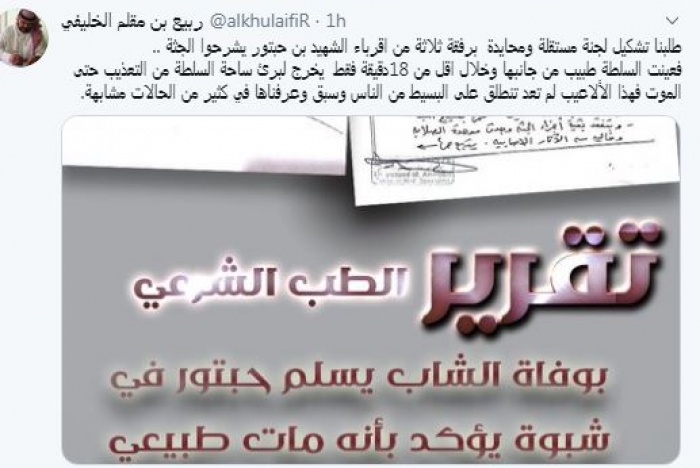 وقال في تغريدة عبر "تويتر" رصدها "المشهد العربي": " طلبنا تشكيل لجنة مستقلة ومحايدة برفقة ثلاثة من أقرباء الشهيد بن حبتور يشرحوا الجثة.. فعينت السلطة طبيب من جانبها وخلال أقل من 18 دقيقة فقط يخرج ليبرئ ساحة السلطة من التعذيب حتى الموت فهذه الألاعيب لم تعد تنطلق على البسيط من الناس وسبق وعرفناها في كثير من الحالات مشابهة".