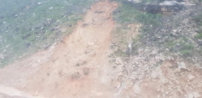 وتضمنت الجولة الاستطلاعية الجوية طريق حيبق الذي أغلقته الإنهيارات الصخرية من الجبل المطل على الطريق.