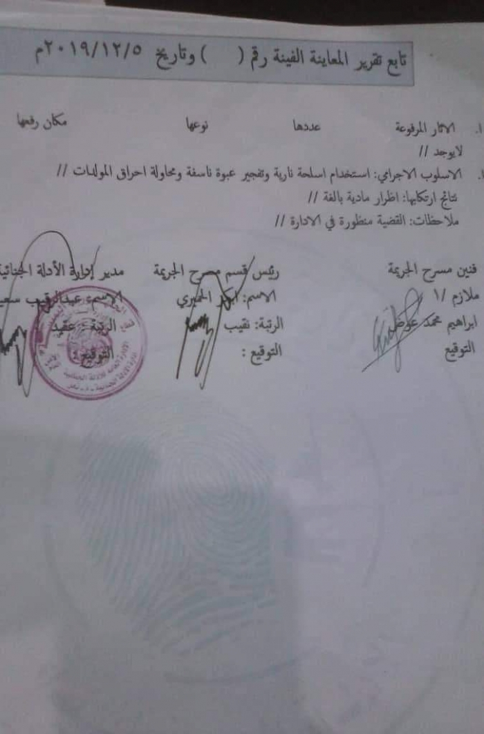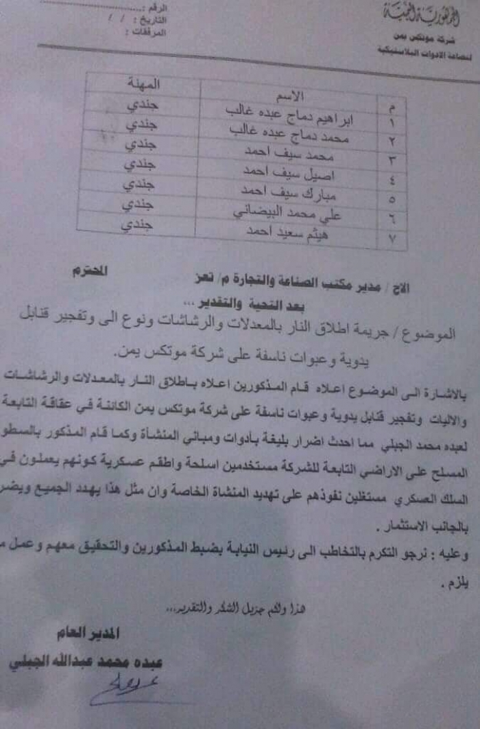 وكشفت عن اعتدائه، بمعية عصابته المسلحة، على مصنع موتيكس للبلاستيك ومحاولة إحراقه بإطلاق النار وإلقاء قنبلة يدوية على المولد الكهربائي الخاص بالمصنع.