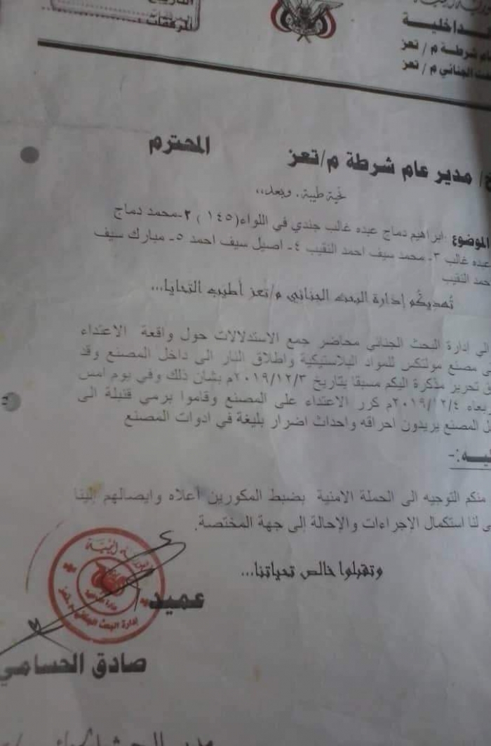 وكشفت عن تقدم أكرم مرشد، بشكاوى على مدار ثلاثة أشهر، إلى قيادة محور تعز ضد المدعو دماج، بعد قيام الأخير بالبسط على أرضه بقوة السلاح بمعية عصابته المسلحة، مؤكدة عدم استجابة المحور لشكاويه، ما دفع مالك الأرض إلى اللجوء للقضاء، حيث صدرت له أحكاما تؤيد ملكيته للأرض وتطالب السلطات التنفيذية بالقبض على المتعدي إبراهيم دماج وإيداعه السجن .
