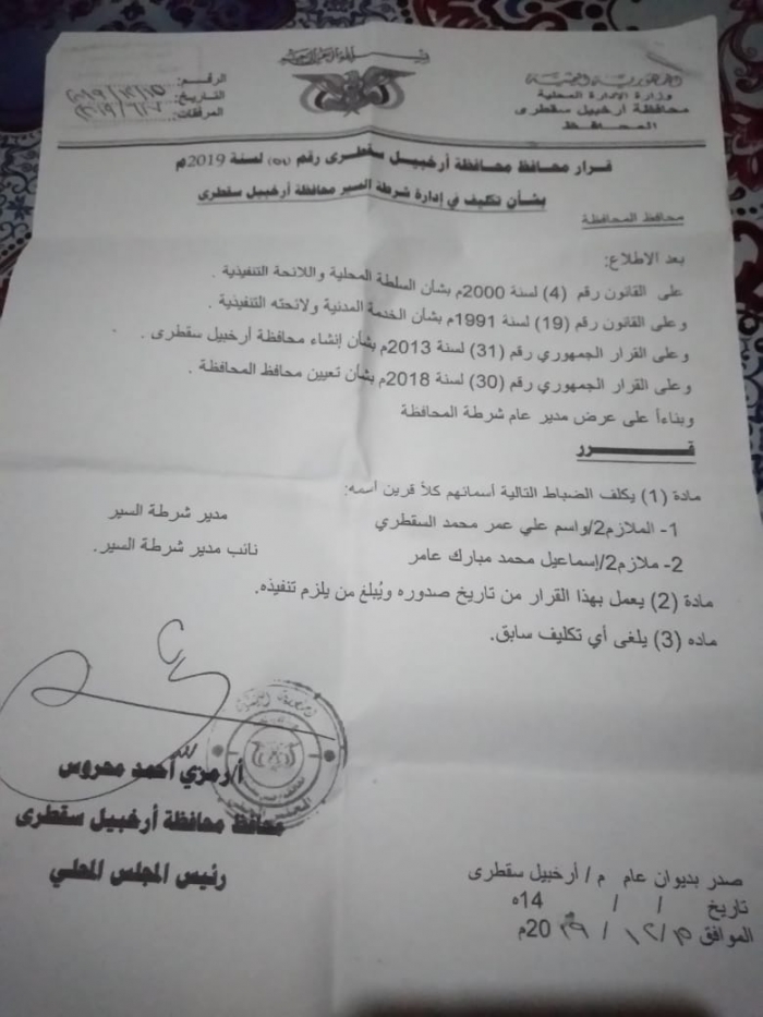 وصلت إلى شرطة السير.. محروس يواصل خطته لتمكين مليشيا الإخوان بسقطرى (وثيقة)