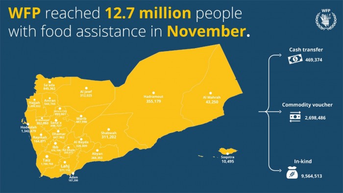 كشف برنامج الأغذية العالمي عن إيصاله مساعدات غذائية لنحو 12.7 مليون شخص باليمن خلال شهر نوفمبر.