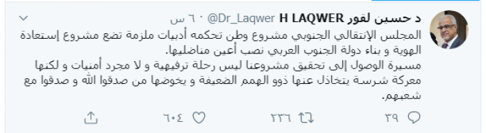 وكتب لقور عبر "تويتر":"المجلس الانتقالي الجنوبي مشروع وطن تحكمه أدبيات ملزمة تضع مشروع استعادة الهوية و بناء دولة الجنوب العربي نصب أعين مناضليها".