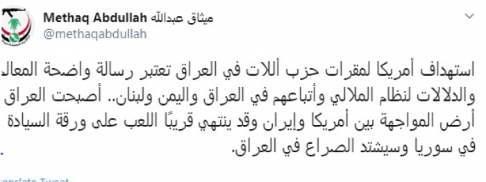 وقال في تغريدة عبر "تويتر" رصدها "المشهد العربي": "استهداف أمريكا لمقرات حزب اللات في العراق تعتبر رسالة واضحة المعالم والدلالات لنظام الملالي وأتباعهم في العراق واليمن ولبنان.. أصبحت العراق أرض المواجهة بين أمريكا وإيران وقد ينتهي قريبًا اللعب على ورقة السيادة في سوريا وسيشتد الصراع في العراق".