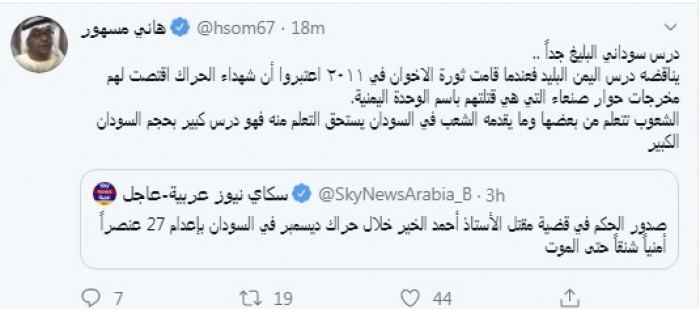 وقال في تغريدة عبر "تويتر" رصدها "المشهد العربي": "درس سوداني البليغ جداً.. يناقضه درس اليمن البليد فعندما قامت ثورة الإخوان في ٢٠١١ اعتبروا أن شهداء الحراك اقتصت لهم مخرجات حوار صنعاء التي هي قتلتهم باسم الوحدة اليمنية".
