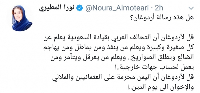 وكتبت المطيري، في تغريدة لها عبر موقع التواصل الاجتماعي تويتر، تابعها المشهد العربي: "هل هذه رسالة أردوغان؟".