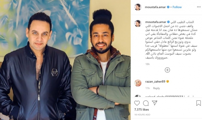 أشاد الفنان مصطفى قمر، بصوت المطرب الشاب "سيف"، ونشر صورة تجمعهما عبر حسابه الرسمي بموقع إنستجرام.