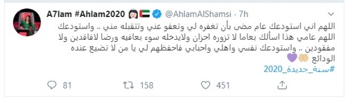 وكتبت أحلام، قائلة:" اللهم اني استودعك عام مضى بأن تغفره لي وتعفوعني وتتقبله مني.. واستودعك اللهم عامي هذا اسألك بعاما لا تزوره أحزان ولايدخله سوء بعافيه ورضا لافاقدين ولا مفقودين.. واستودعك نفسي وأهلي وأحبابي فاحفظهم لي يا من لا تضيع عنده الودائع"، وبعد تغريدتها هنأها جمهورها بالعام الجديد، متمنين لها سنة سعيد والمزيد من النجاح.
