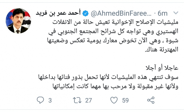 وكتب بن فريد، في تغريدة له عبر موقع التواصل الاجتماعي تويتر، تابعها المشهد العربي: "مليشيات الإصلاح تواجه كل شرائح المجتمع الجنوبي في شبوة، وهي الآن تخوض معارك يومية تعكس وضعيتها المهترئة هناك".