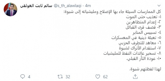 وقال في تغريدة عبر "تويتر" رصدها "المشهد العربي": "كل الممارسات السيئة جاء بها الإصلاح ومليشياته إلى شبوة: تعذيب حتى الموت.. إعدام المتظاهرين.. قصف قرى القبائل.. تسييس المنابر.. تعبئة دينية في المعسكرات.. معاهد للتطرف الحزبي.. استقدام الأتراك لشبوة.. تسخير عائدات النفط للمليشيات.. عودة الثأر القبلي. لهذا لفظتهم شبوة".