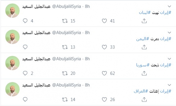 وكتب في تغريدة عبر "تويتر" رصدها "المشهد العربي": "إيران اغتالت العراق وذبحت سوريا ودمرت اليمن ونهبت لبنان".