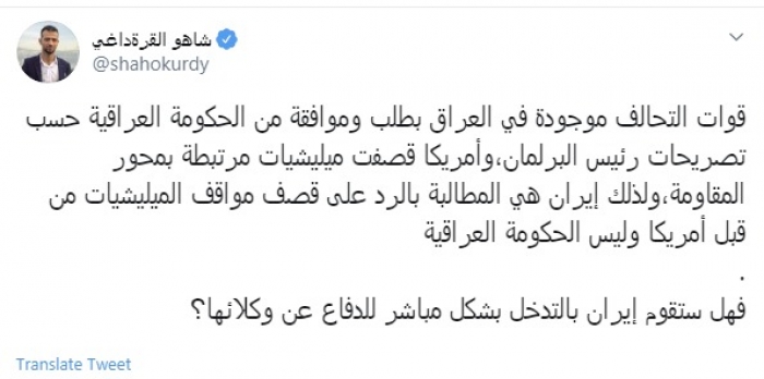 وقال في تغريدة عبر "تويتر" رصدها "المشهد العربي": "قوات التحالف موجودة في العراق بطلب وموافقة من الحكومة العراقية حسب تصريحات رئيس البرلمان، وأمريكا قصفت ميليشيات مرتبطة بمحور المقاومة، ولذلك إيران هي المطالبة بالرد على قصف مواقف الميليشيات من قبل أمريكا وليس الحكومة العراقية.. فهل ستقوم إيران بالتدخل بشكل مباشر للدفاع عن وكلائها؟".