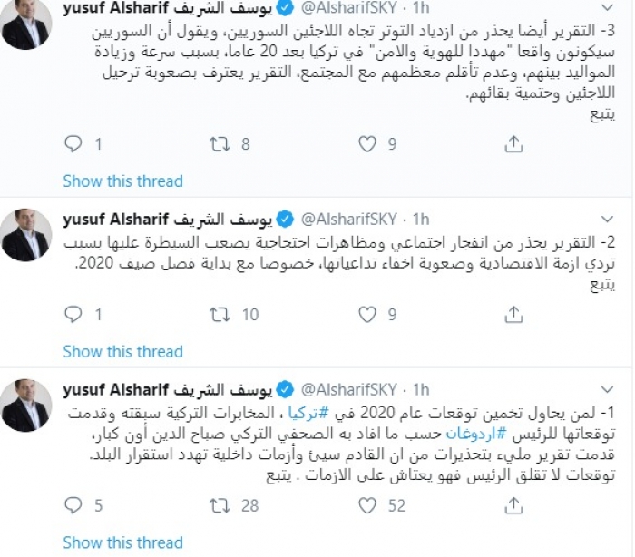 وأوضح: "التقرير أيضًا يُحذر من ازدياد التوتر تجاه اللاجئين السوريين، ويقول أن السوريين سيكونون واقعا مهددا للهوية والأمن في تركيا بعد 20 عامًا، بسبب سرعة وزيادة المواليد بينهم، وعدم تأقلم معظمهم مع المجتمع، التقرير يعترف بصعوبة ترحيل اللاجئين وحتمية بقائهم".