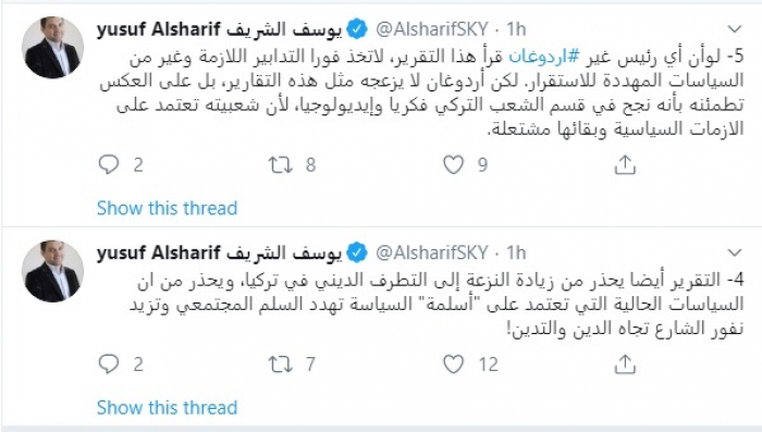 وواصل: "لوأن أي رئيس غير أردوغان قرأ هذا التقرير، لاتخذ فورًا التدابير اللازمة وغير من السياسات المهددة للاستقرار. لكن أردوغان لا يزعجه مثل هذه التقارير، بل على العكس تطمئنه بأنه نجح في قسم الشعب التركي فكريًا وأيديولوجيًا، لأن شعبيته تعتمد على الأزمات السياسية وبقائها مشتعلة".