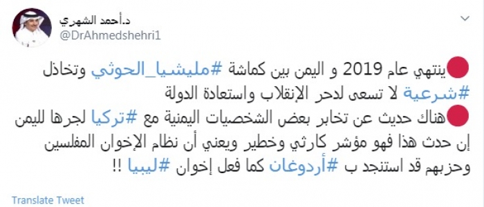 وقال في تغريدة عبر "تويتر" رصدها "المشهد العربي": "ينتهي عام 2019 واليمن بين كماشة مليشيا الحوثي وتخاذل شرعية لا تسعى لدحر الانقلاب واستعادة الدولة.. هناك حديث عن تخابر بعض الشخصيات اليمنية مع تركيا لجرها لليمن إن حدث هذا فهو مؤشر كارثي وخطير ويعني أن نظام الإخوان المفلسين وحزبهم قد استنجد بأردوغان كما فعل إخوان ليبيا".
