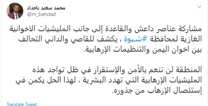 أكد الناشط السياسي محمد سعيد باحداد، أن مشاركة عناصر القاعدة وداعش بجانب مليشيات الإخوان -التابعة لحكومة الشرعية- في ارتكاب الجرائم بحق أبناء محافظة شبوة، يكشف حقيقة التحالف بينهم.