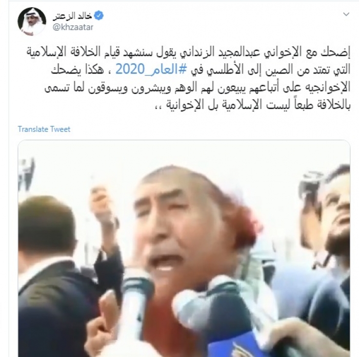 سخر المحلل السياسي السعودي خالد الزعتر، اليوم، من القيادي الإخواني عبدالمجيد الزنداني، جراء تصريحاته بشأن قيام الخلافة الإسلامية المزعومة في عام 2020.