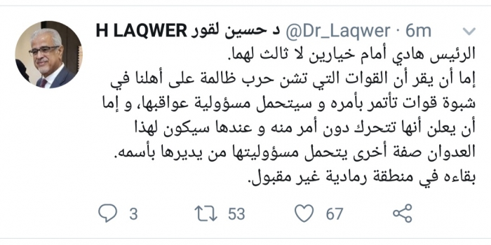 وكتب لقور، في تغريدة له عبر موقع التواصل الاجتماعي تويتر، تابعها المشهد العربي: " الرئيس هادي أمام خيارين لا ثالث لهما.. إما أن يقر أن القوات التي تشن حرب ظالمة على أهلنا في شبوة قوات تأتمر بأمره و سيتحمل مسؤولية عواقبها".