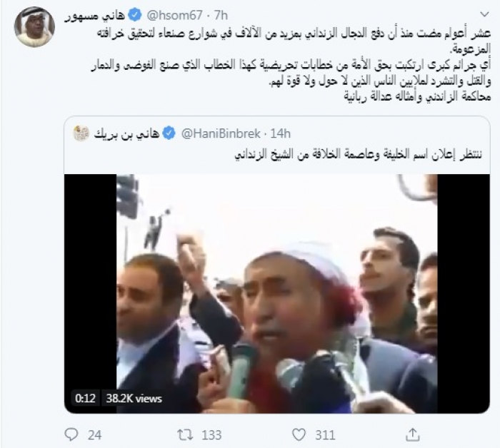 وقال في تغريدة عبر "تويتر" رصدها "المشهد العربي": "عشر أعوام مضت منذ أن دفع الدجال الزنداني بمزيد من الآلاف في شوارع صنعاء لتحقيق خرافته المزعومة. أي جرائم كبرى ارتكبت بحق الأمة من خطابات تحريضية كهذا الخطاب الذي صنع الفوضى والدمار والقتل والتشرد لملايين الناس الذين لا حول ولا قوة لهم. محاكمة الزاندني وأمثاله عدالة ربانية".