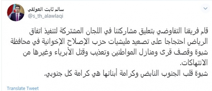 وقال في تغريدة عبر "تويتر" رصدها "المشهد العربي": "قام فريقنا التفاوضي بتعليق مشاركتنا في اللجان المشتركة لتنفيذ اتفاق الرياض احتجاجًا على تصعيد مليشيات حزب الإصلاح الإخوانية في محافظة شبوة وقصف قرى ومنازل المواطنين وتعذيب وقتل الأبرياء وغيرها من الانتهاكات. شبوة قلب الجنوب النابض وكرامة أبنائها هي كرامة كل جنوبي".