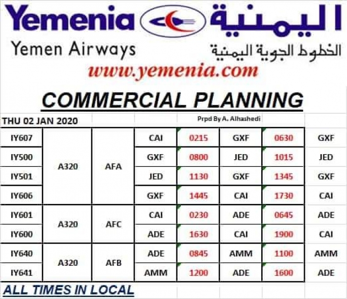 ينشر "المشهد العربي" مواعيد رحلات طيران اليمنية غداً الخميس، الموافق الثاني من يناير 2020.