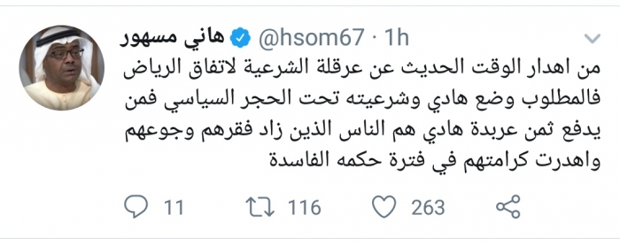 وكتب مسهور، في تغريدة له عبر موقع التواصل الاجتماعي تويتر، تابعها المشهد العربي: "من إهدار الوقت الحديث عن عرقلة الشرعية لاتفاق الرياض".