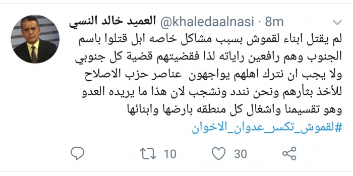 وكتب النسي، في تغريدة له عبر موقع التواصل الاجتماعي تويتر، تابعها المشهد العربي: " ‏لم يقتل أبناء لقموش بسبب مشاكل خاصة بل قتلوا باسم الجنوب وهم رافعين راياته".