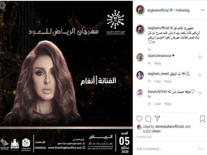 ونشرت أنغام، بوستر الحفل عبر حسابها على"إنستجرام": "جمهوري الغالي في الرياض.. لقاؤنا يتجدد يوم 5 يناير على مسرح أبو بكر سالم، ضمن فعاليات مهرجان العود، موسم الرياض".