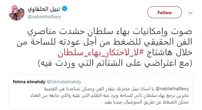 ودعم الحلفاوي بهاء سلطان، وكتب ردا على سؤال أحد متابعيه بإمكانيه تدخله في الأمر: "صوت وإمكانيات بهاء سلطان حشدت مناصري الفن الحقيقي للضغط من أجل عودته للساحة من خلال هاشتاج #لا_لاحتكار_بهاء_سلطان، مع اعتراضي على الشتائم التي وردت فيه".