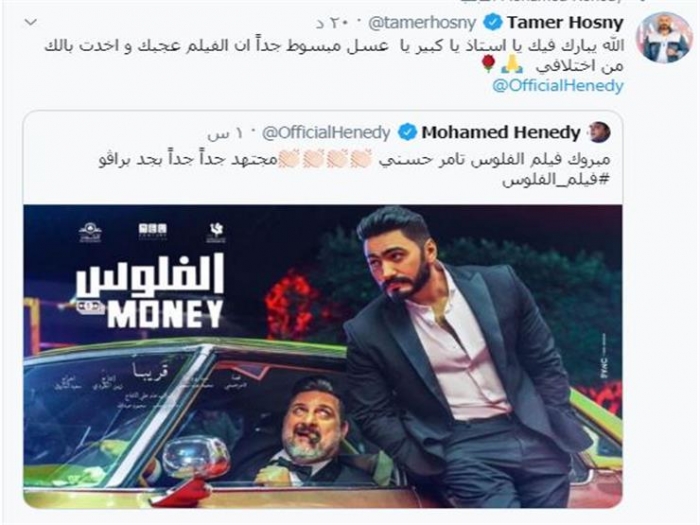 وكتب هنيدي: "مبروك فيلم الفلوس تامر حسني، مجتهد جدا جدا، بجد براڤو".