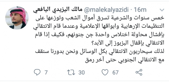 وكتب اليافعي، في تغريدة له عبر موقع التواصل الاجتماعي تويتر، تابعها المشهد العربي: "خمس سنوات والشرعية تسرق أموال الشعب وتوزعها على التنظيمات الإرهابية وأبواقها الإعلامية".